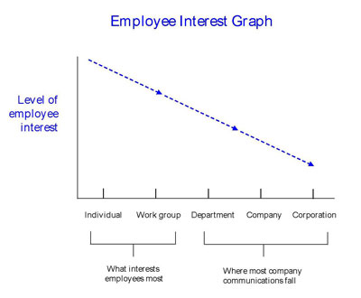 Another key factor in successful communication is to talk at the level of employees’ understanding and interest. The interest graph below makes what may seem a simple point but it is crucially important. Indeed, many companies offend the point regularly by communicating information largely at the right end of the graph!