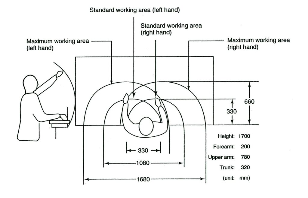 One of the most productive approaches to that is to concentrate on making the job easier to do. As a rule, we know that will add at least 10% more productivity by itself. For example, if employees are using the same items and equipment repeatedly in doing their job, then it’s useful to keep these regular items within easy reach, so that they can get into a rhythm and don’t have to stretch or strain. Here’s a drawing which will illustrate the point.